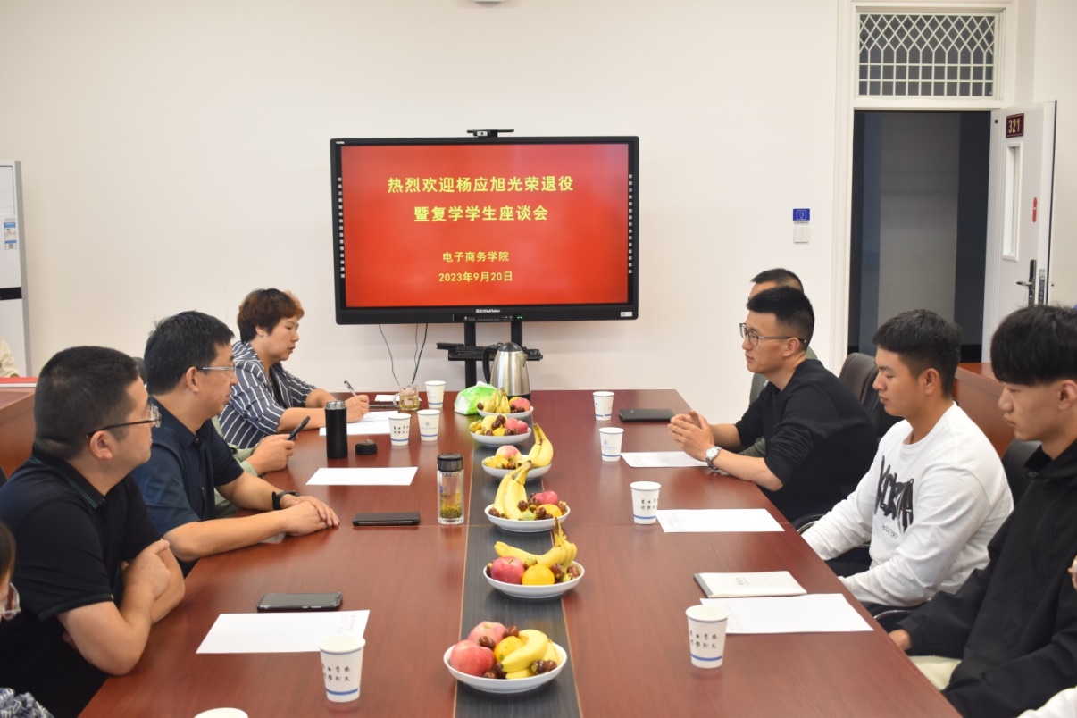 日下午公司召开退役复学员工座谈会,公司领导、辅导员及班主任,退役复学员工杨应旭,马学岩、高国泉、刘芳辉参加会议。